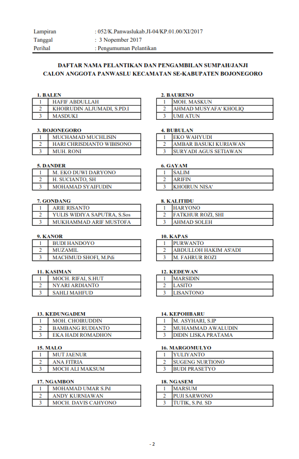 Daftar peserta Pelantikan dan Sumpah Janji Calon Anggota PANWASLU Kecamatan se-Kabupaten Bojonegoro berdasarkan Pengumuman Panitia Pengawas Pemilihan Umum Kabupaten Bojonegoro Tahun 2017 Nomor :
